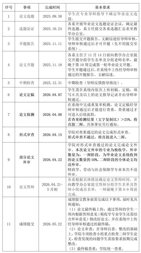 2.毕业生需高度重视论文撰写与各环节审查工作,按要求完成自查、整改,确保毕业论文质量;各位导师需切实履行指导职责,严把论文各环节质量关。